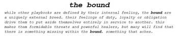 the bound — every choice the bound has ever made came down to one thing. the thing that defines their character, that they are loyal to above all else, whether that be a person or an ideal. it makes them brave defenders, but it makes them... dangerous. after all, can you trust someone who has never really thought for themselves?